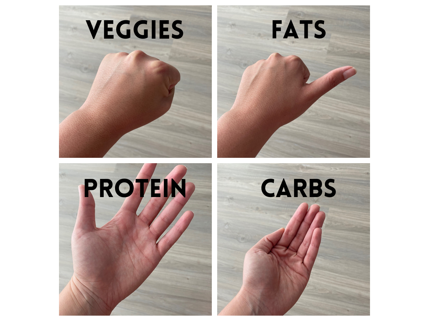 I would then get a food scale and get curious about serving sizes and proper portions. When weighing food out, its usually quite shocking how small a serving size is of a tablespoon of nut butter or a cup of cooked pasta. All of this is to build awareness and education as a foundation. Then once I got the hang of this, I would build my meals based on protein and vegetables first, and then add carbs and fats afterwards. Here is a simple hand guide to help you get started with visualizing meals.